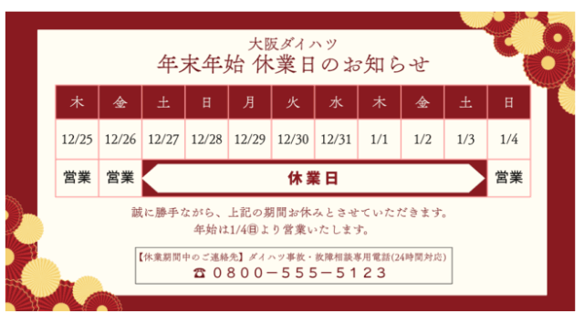 誠に勝手ながら、下記期間、年末年始休業日となります。